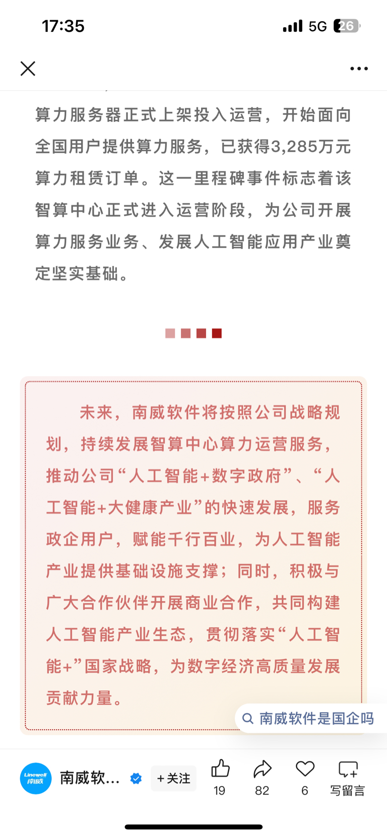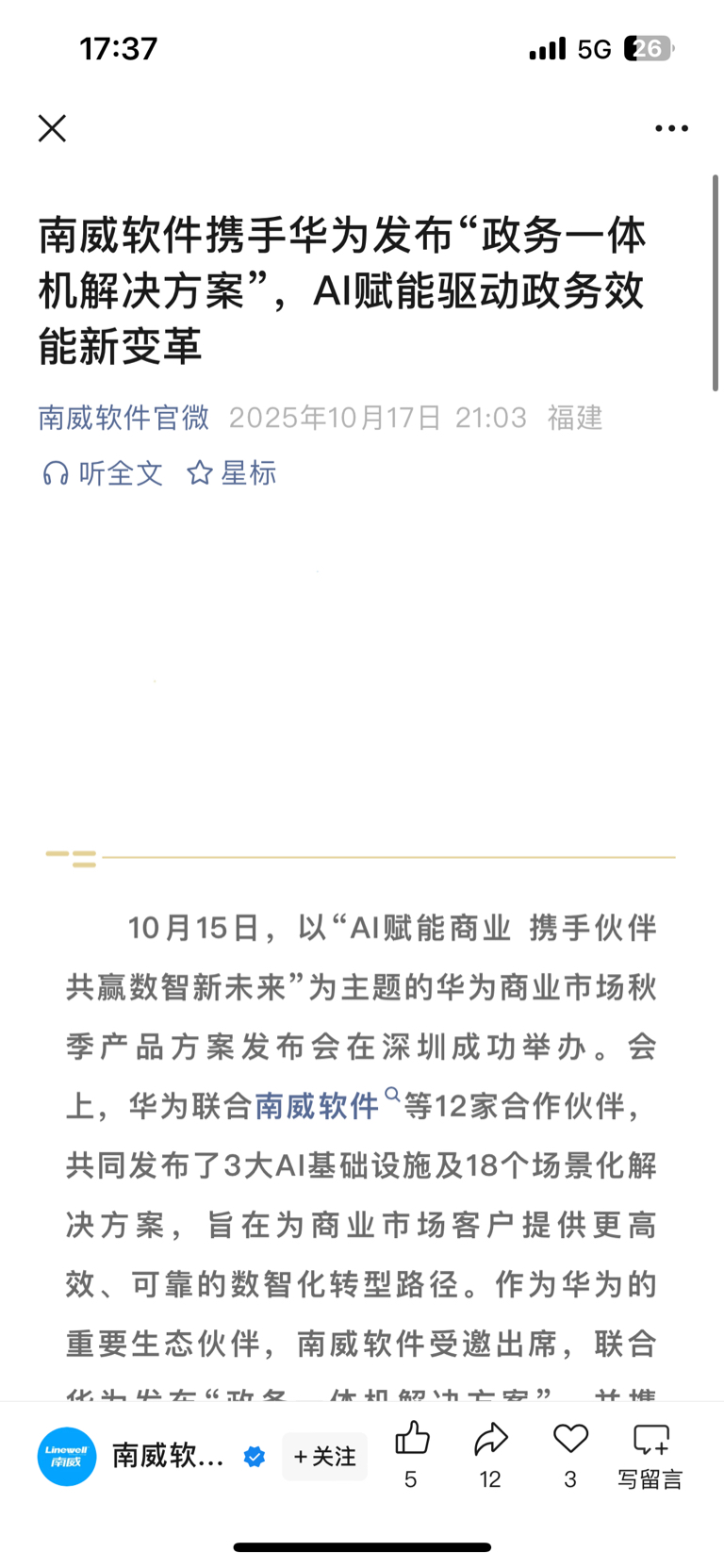 $南威软件(SH603636)$ 官网上面太多了,全部亲儿子,政务一体机,华为发布的,南威合作。北京算力中心,阿里是重要股东,ai ai智能体大模型!人工智能龙头企业,董事长吹的500亿市值明年能照进现实吗?