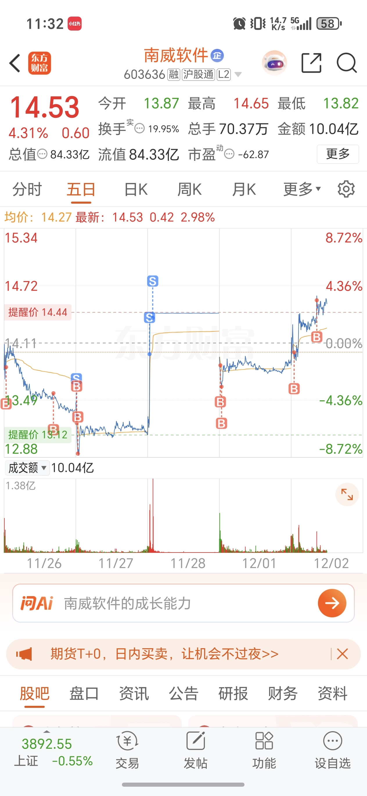 加仓了,昨天接回了前面卖的。今天竞价卖飞了航发,一半买了雷科,一半拿来加仓南威了