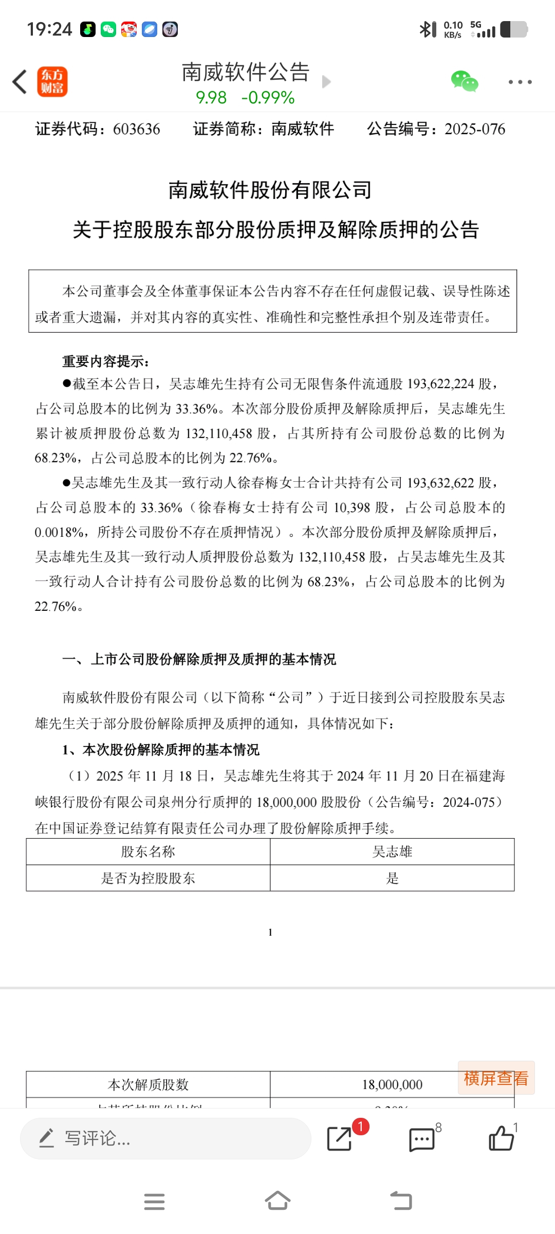 $南威软件(SH603636)$ 质押1.32亿股,10.44元是预警线,9.13元触发券商抛售线,也就是说,大股东接近爆仓了,接近这个平仓价,会无限制抛售,股价直接会干到8元。现在已经接近股东爆仓位置了,一点维护都没有。千万注意了兄弟们。