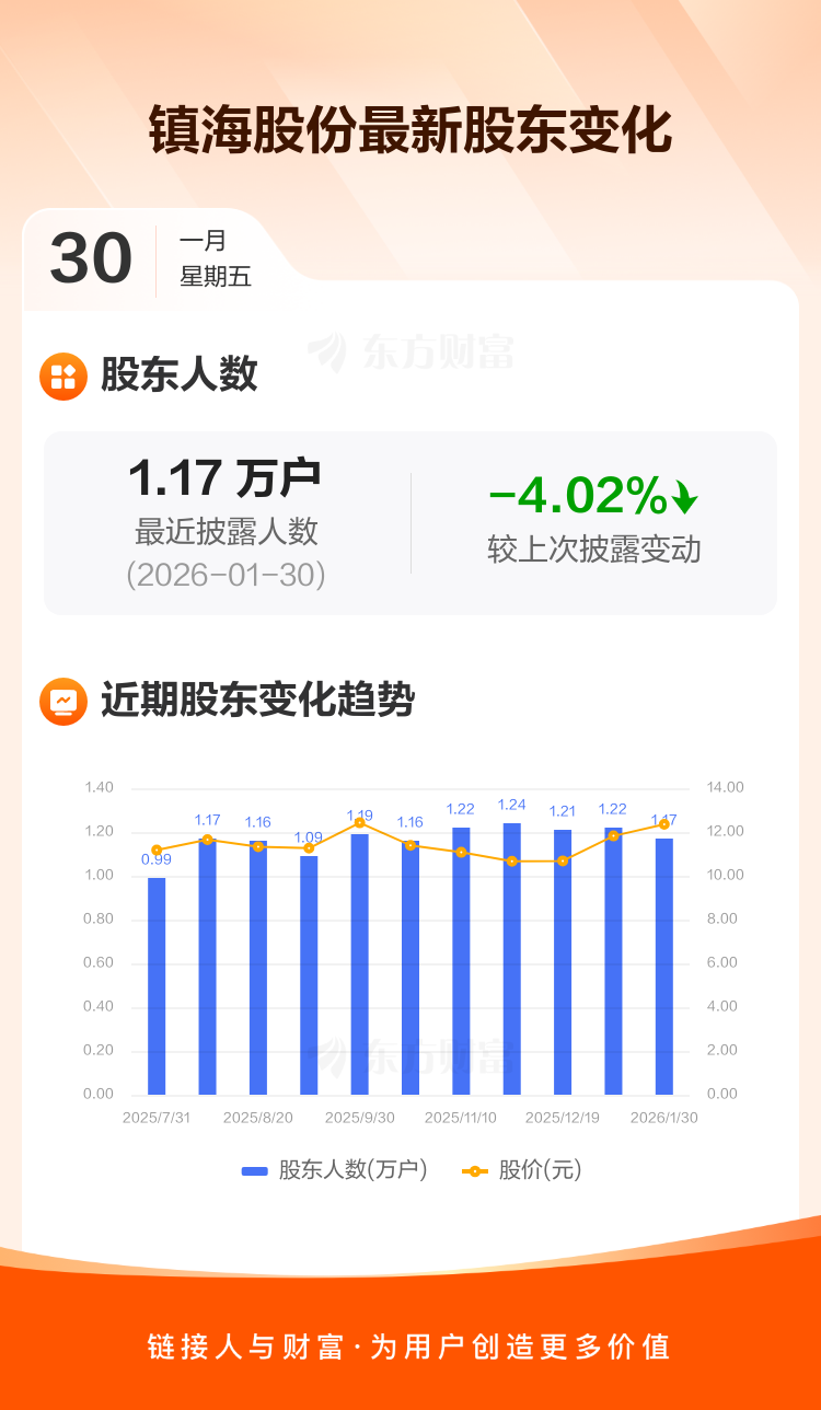 镇海股份:截至1月30日最新股东户数1.17万户,较上期减少4.02%