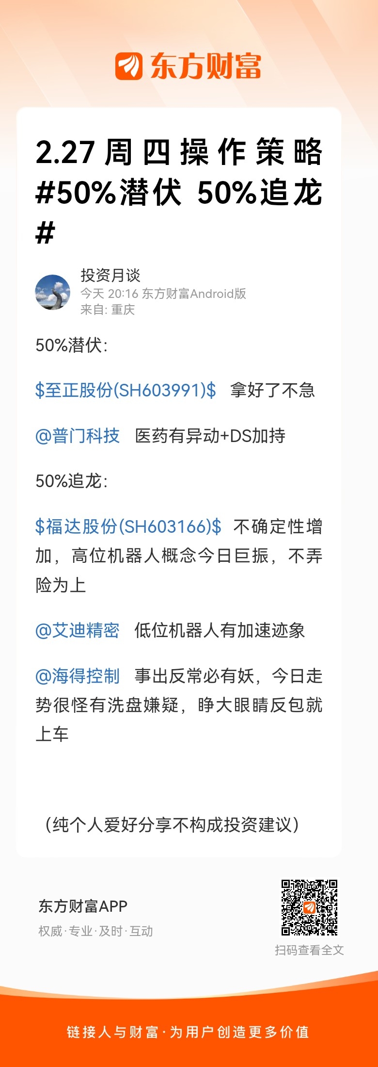 温馨提示: 1.根据《证券法》规定,禁止编造、传播虚假信息或者误导性信息,扰乱证券市场;2.用户在本社区发表的所有资料、言论等仅代表个人观点,与本网站立场无关,不对您构成任何投资建议。用户应基于自己的独立判断,自行决定证券投资并承担相应风险。《东方财富社区管理规定》