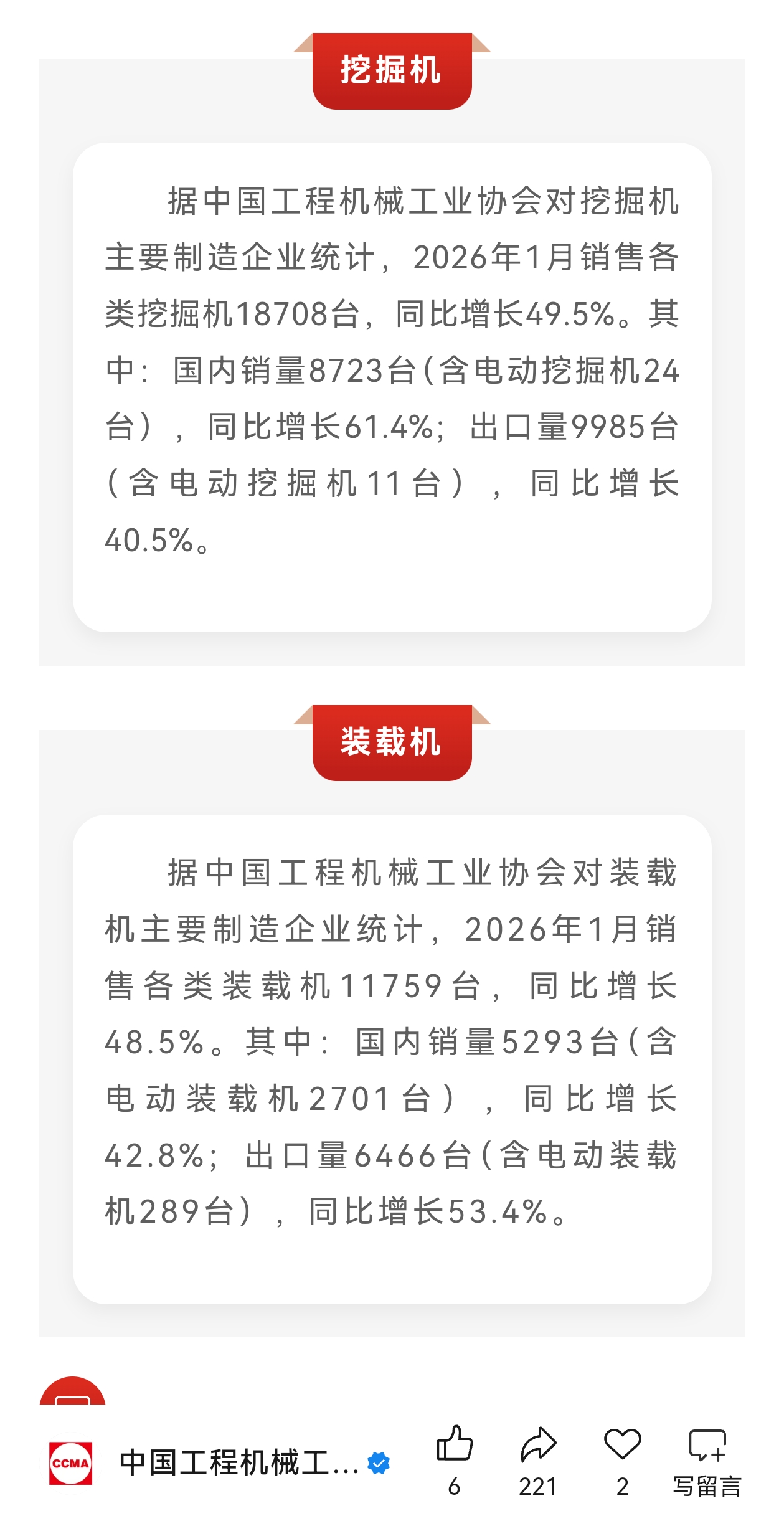 $艾迪精密(SH603638)$ 据中国工程机械工业协会数据,2026年1月受春节错期等因素推动,国内挖掘机销量同比大幅攀升61.4%,出口市场增长41%,交出超市场预期的开门红成绩单。这一亮眼表现,充分验证了市场此前对于国内下游需求正在逐步修复回暖的乐观预期。同时,上游核心液压件等零部件企业排产拉满、订单量大幅增长,行业内外需共振向上的景气周期趋势愈发明确,看好艾迪精密后续表现。
