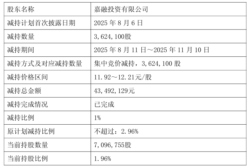 11月10日盘后,畅联股份(603648)公告称,公司收到嘉融投资有限公司(以下简称“嘉融投资”)《关于减持股份结果的告知函》。2025年8月11日至11月10日,嘉融投资通过集中竞价交易方式减持362.41万股,占公司目前总股本的比例为1%,减持总金额约4349.21万元。