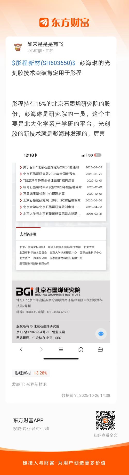 彤程持有16%的北京石墨烯研究院的股份,彭海琳是研究院的一员,这个主要是北大化学系产学研的平台。光刻胶的新技术就是彭海琳发现的,厉害