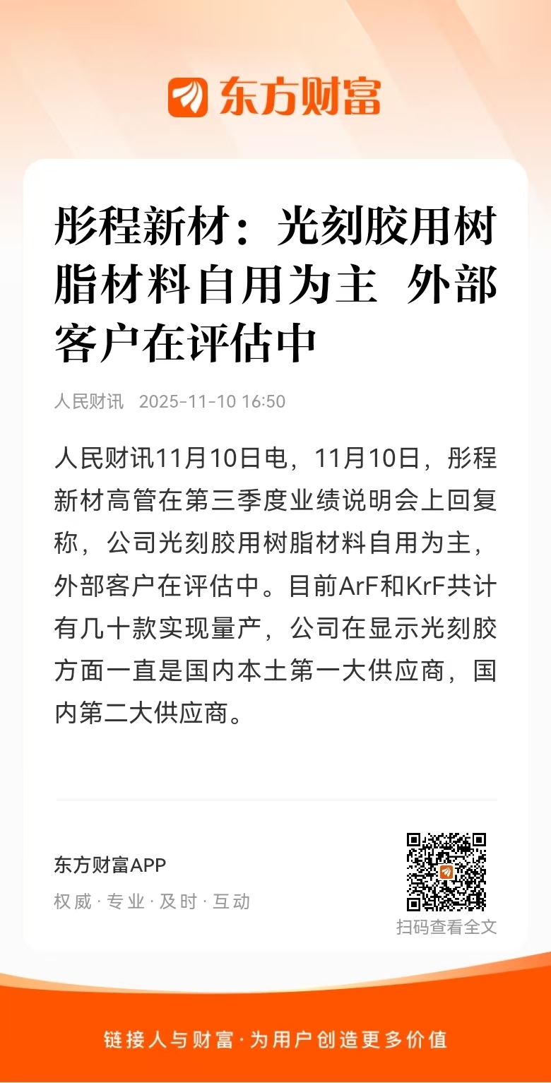 $彤程新材(SH603650)$ 光刻胶国内本土第一大供应商,国内第二大供应商——有前途!!