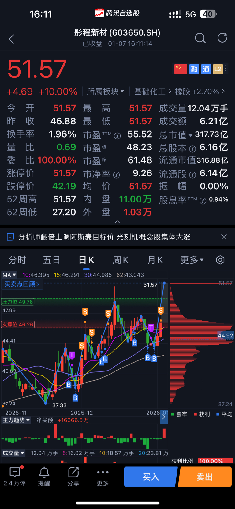 $彤程新材(SH603650)$ 太气了昨天卖了一半