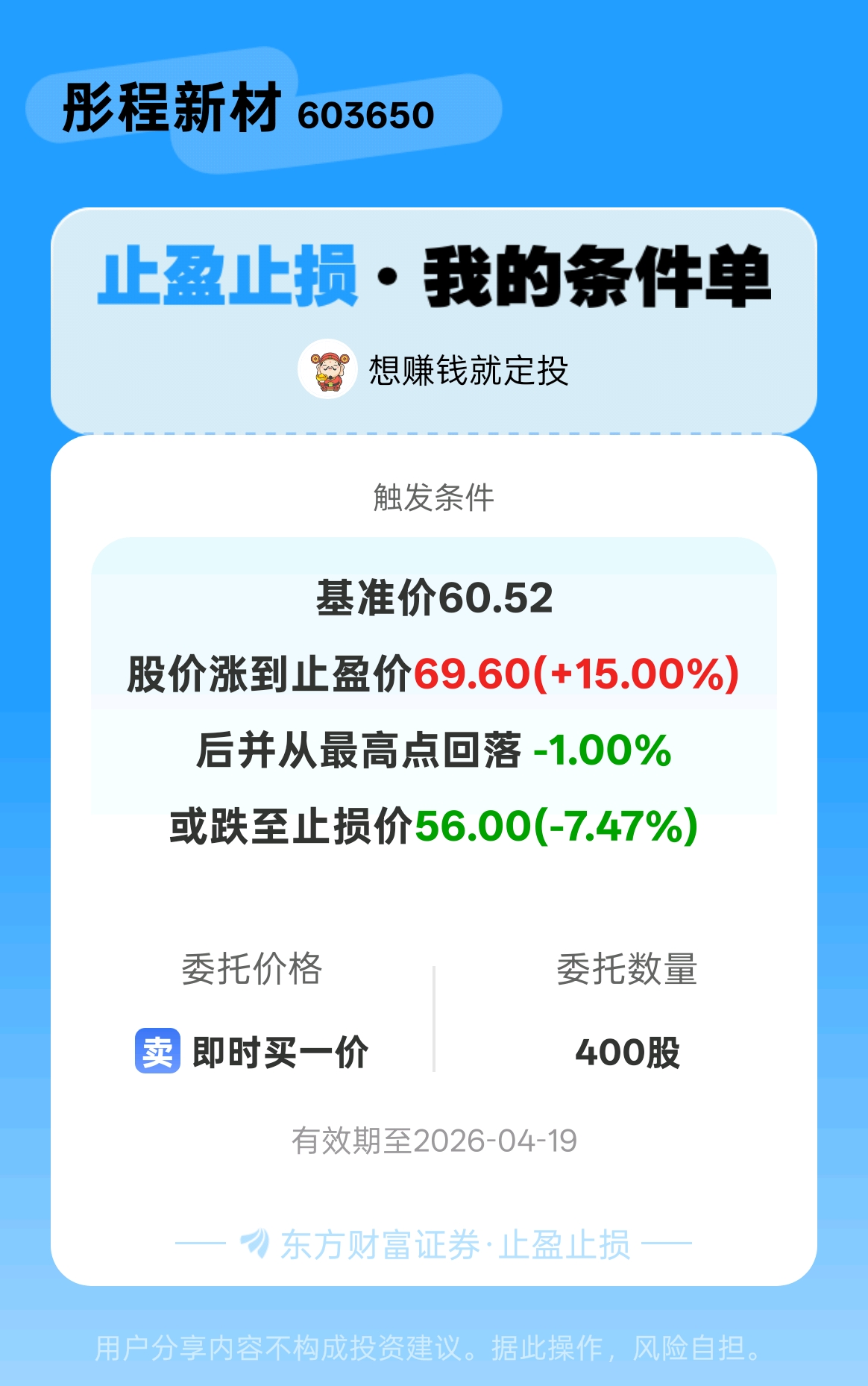 #条件单交流# #止盈止损晒单# 一位股神设置了一个止盈止损条件单,接下来就是见证奇迹的时刻~$彤程新材(SH603650)$