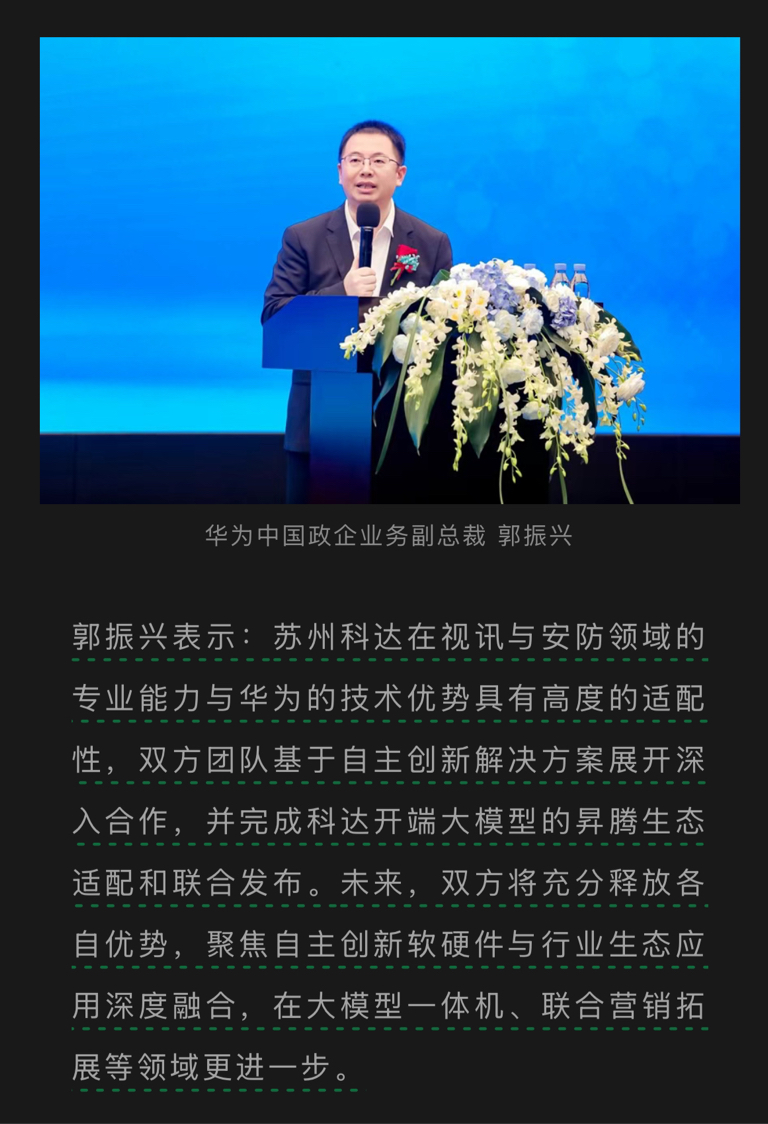 $苏州科达(SH603660)$ 苏州科达在视讯与安防领域的专业能力与华为的技术优势具有高度的适配性,双方团队基于自主创新解决方案展开深入合作,并完成科达开端大模型的昇腾生态适配和联合发布。未来,双方将充分释放各自优势,聚焦自主创新软硬件与行业生态应用深度融合,在大模型一体机、联合营销拓展等领域更进一步。