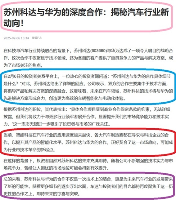 在2月6日的投资者关系平台上,一位热心的投资者询问道:“苏州科达与华为的合作具体细节是什么?”对此,苏州科达给出了详细的回应。公司表示,双方的合作主要集中于技术方面,将倡导产品和解决方案的深度融合。这意味着,未来在汽车领域,苏州科达的技术将与华为的先进解决方案形成合力,创造更为高效的车辆智能化与电动化体验。