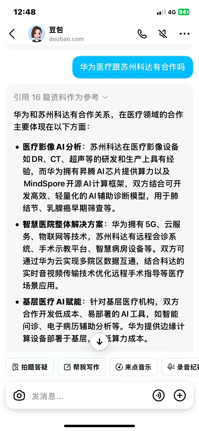 技术协同与全面合作:苏州科达在医疗影像设备(像DR、CT、超声等)的研发和生产上经验丰富,华为则在昇腾AI芯片、MindSpore框架以及云服务等方面具备优势。双方于2024年10月签署了全面合作协议,旨在优势互补,共同打造多场景联合解决方案。合作内容涵盖医疗影像AI分析、智慧医院整体解决方案等,借助华为云实现多院区数据互通,结合科达的实时音视频传输技术优化远程手术指导。