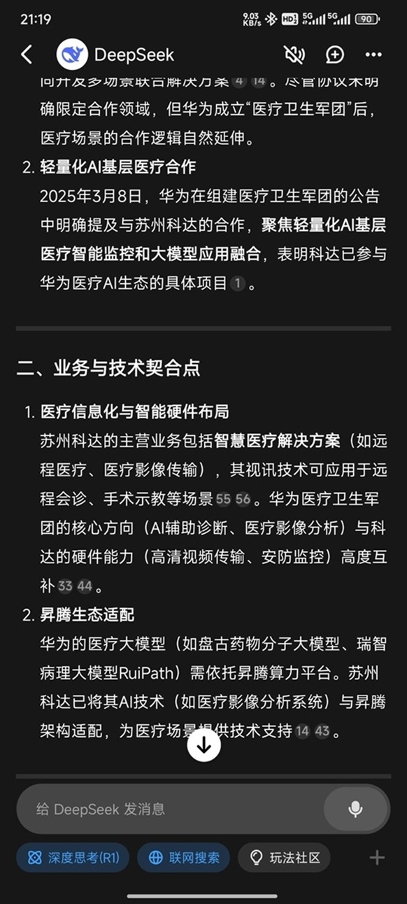 2025年2月26日,苏州科达(603660.SH)在投资者互动平台表示,公司在自研的服务器硬件产品上对包含DeepSeek多个版本在内的开源模型进行了适配性测试和内部试用。苏州科达AI智能体除了借助行业优秀模型的算法和技术架构不断提升公司自有的开端大模型外,公司具备为客户提供基于DeepSeek不同参数的一体机产品和行业定制需要。
