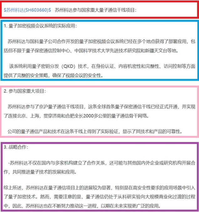 苏州科达国产化人工智能多模态图像与视频技术的研发及产业化项目环评已于2025年1月公示,项目建成后,将形成年产智能摄像机30万台、终端3万台、平台300套和存储服务器1000台的生产能力。该项目为公司2025年度规划的研发方向之一,目前相关工作已有序开展。公司是国内重要的音视频产品与解决方案提供商,产品涵盖各类摄像机、音视频处理终端、业务平台软件及各类存储与应用服务器等。在公司为客户构建的解决方案中,需要实现大量音视频数据的采集、存储、分析与应用,通常需要搭建大容量的存储平台。同时,苏州科达的量子全息技术运用于视频会议上,公司支持量子通信的视频会议产品已有在客户侧进行应用。此外,公司在总部搭建了一套全息网呈的演示环境。苏州科达AI智能体KD-GPT是多模态、行业语言和图像视频生成等多个大模型的组合,2025年2月26日,苏州科达(603660.SH)在投资者互动平台表示,公司在自研的服务器硬件产品上对包含DeepSeek多个版本在内的开源模型进行了适配性测试和内部试用,除了借助行业优秀模型的算法和技术架构不断提升公司自有的开端大模型外,公司具备为客户提供基于DeepSeek不同参数的一体机产品和行业定制需要。公司在自研的服务器硬件产品上对包含DeepSeek多个版本在内的开源模型进行了适配性测试和内部试用,除了借助行业优秀模型的算法和技术架构不断提升公司自有的开端大模型外,公司具备为客户提供基于DeepSeek不同参数的一体机产品和行业定制需要。