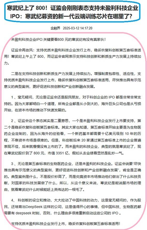 寒武纪股价 800元,市值3351亿元!但证监会官网表示支持科技创新和新质生产力发展上持续加力,在支持科技创新和新质生产力发展上持续加力,增强制度包容性、适应性,支持优质未盈利科技企业发行上市,稳妥恢复科创板第五套标准适用,尽快推出具有示范意义的典型案例,更好促进科技创新和产业创新融合发展。