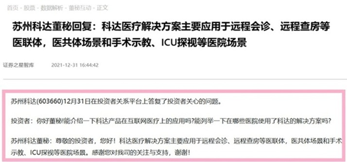 科达侧:远程会诊系统、手术示教平台、智慧病房设备。