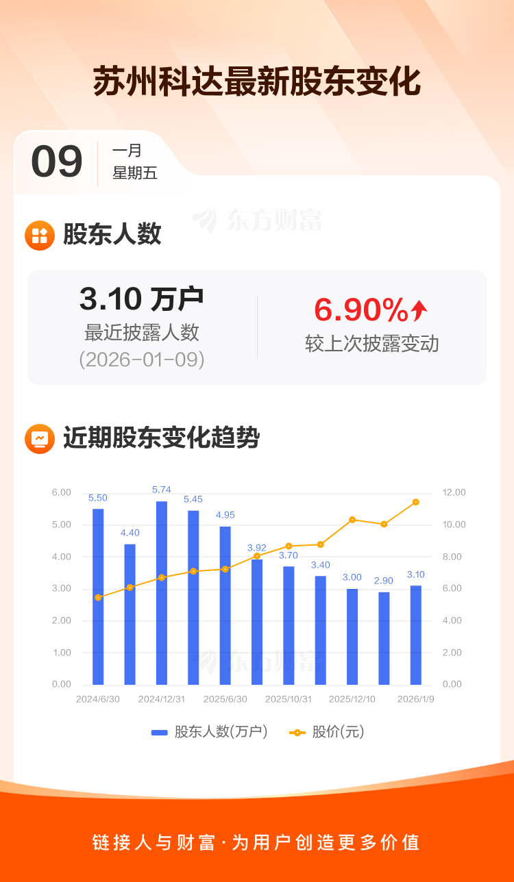 苏州科达最新披露数据显示,截至1月9日公司股东户数为3.10万户,较上期(2025年12月19日)增加2000户,增幅为6.90%。户均持有流通股数量由上期的1.97万股下降至1.84万股,户均持股金额由上期的19.81万元增加至21.07万元。