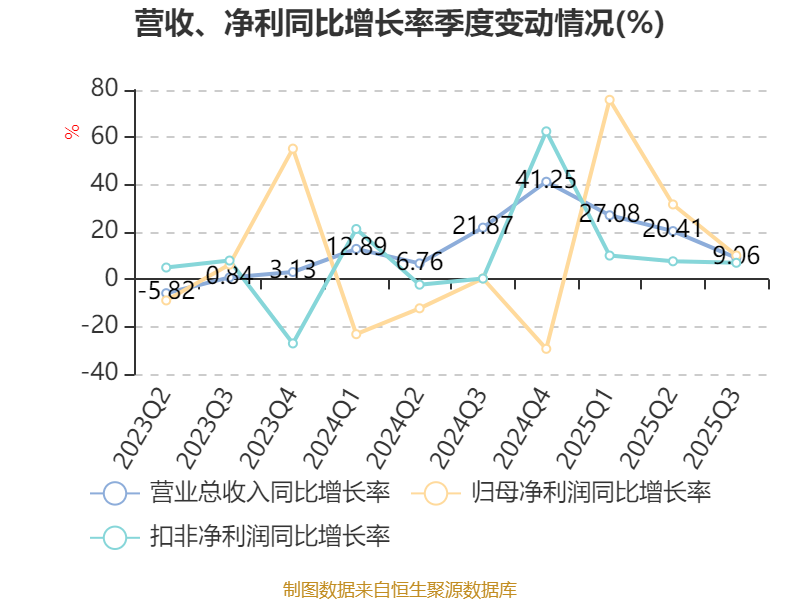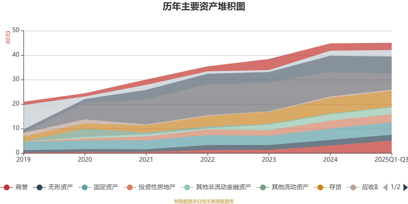 资产重大变化方面,截至2025年三季度末,公司交易性金融资产合计较上年末减少35.61%,占公司总资产比重下降8.03个百分点;商誉较上年末增加66.76%,占公司总资产比重上升4.48个百分点;货币资金较上年末增加29.19%,占公司总资产比重上升1.29个百分点;应收票据及应收账款较上年末增加7.19%,占公司总资产比重上升0.99个百分点。