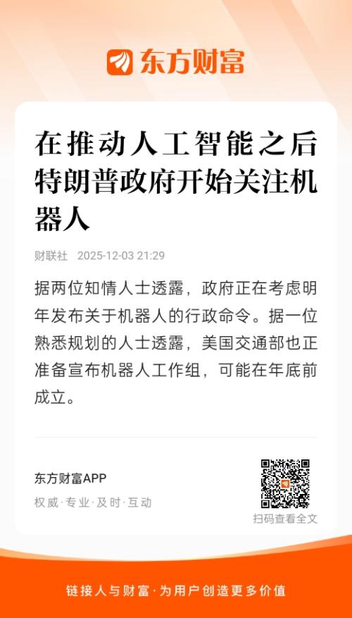 据报道,在发布加速人工智能发展计划五个月后,特朗普政府开始转向机器人。据三位知情且匿名透露细节的人士透露,美国商务部长霍华德·卢特尼克一直在与机器人行业的CEO会面,并全力以赴加速行业发展。据两位知情人士透露,政府正在考虑明年发布关于机器人的行政命令。据一位熟悉规划的人士透露,美国交通部也正准备宣布机器人工作组,可能在年底前成立。该部门发言人未回应置评请求。