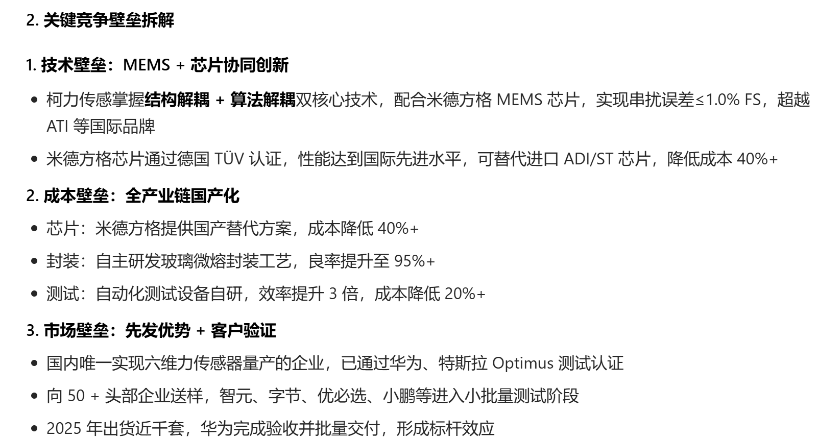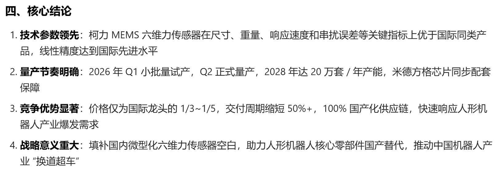 柯力传感公司已向国内多家人形机器人领域客户提供样品并配合测试,其中部分客户已取得批量订单。公司是国内唯一实现六维力传感器量产的企业。