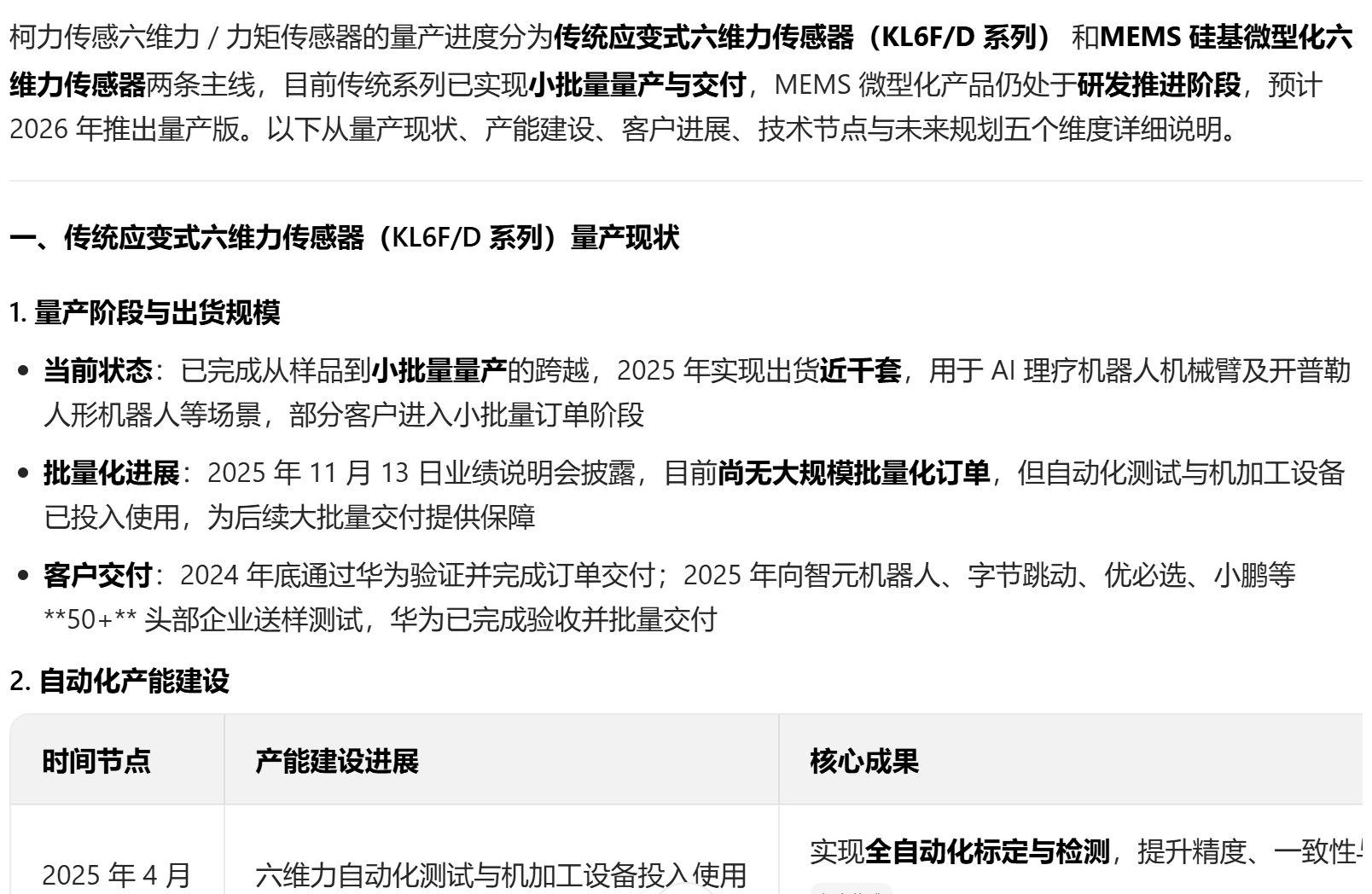 柯力传感公司已向国内多家人形机器人领域客户提供样品并配合测试,其中部分客户已取得