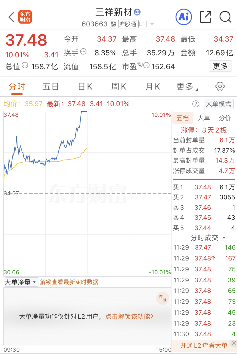 三祥新材再度强势拉升涨停