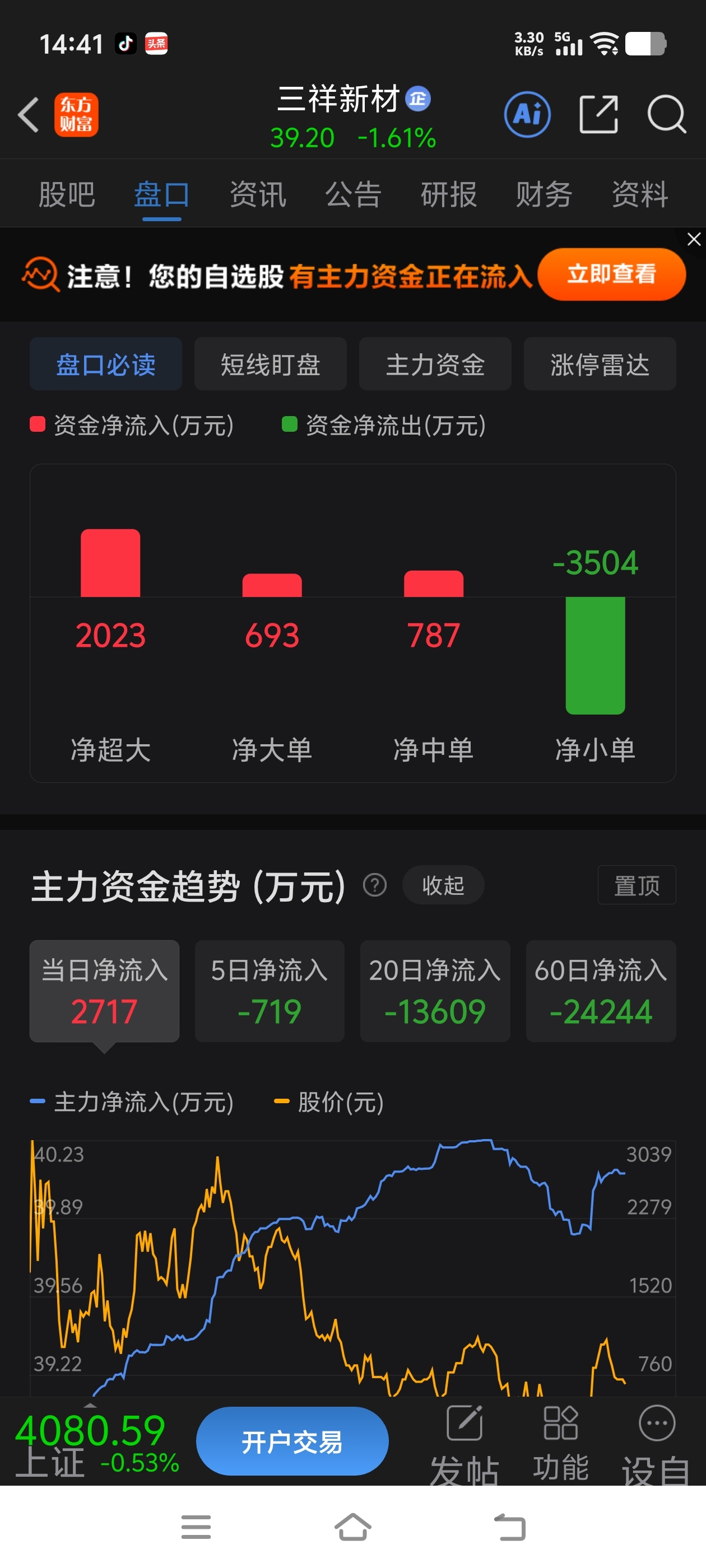 $三祥新材(SH603663)$ 主力资金大福流入,洗盘