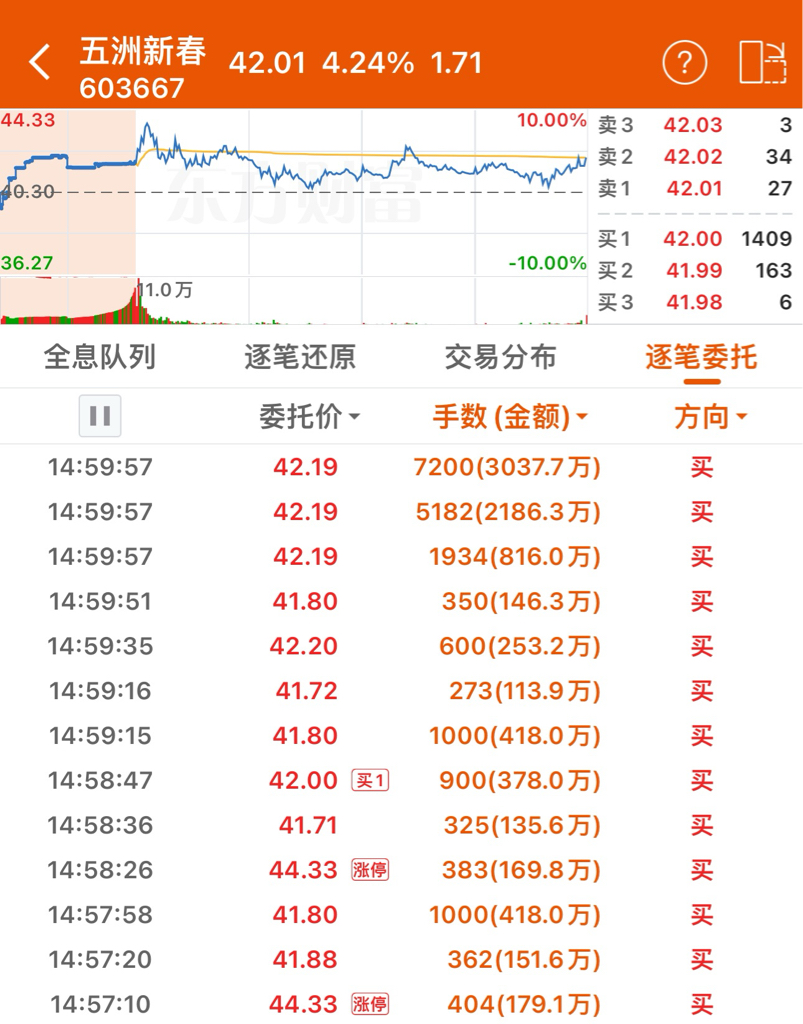 $五洲新春(SH603667)$ 集合竞价最后3秒抢筹6000万,周一又要涨停了