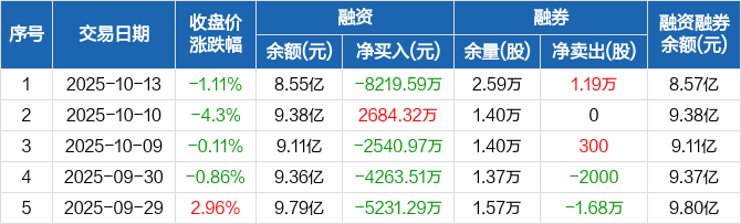 五洲新春:融资净偿还8219.59万元,融资余额8.55亿元(10-13)