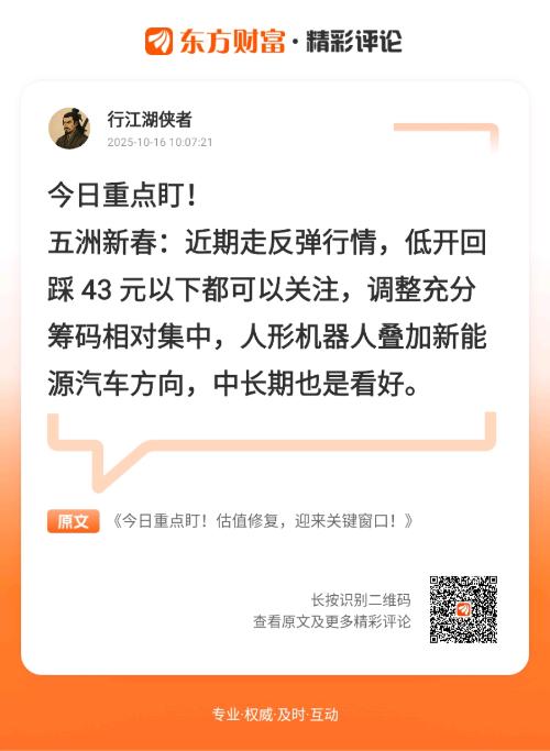 $五洲新春(SH603667)$:通用设备+人形机器人+新能源汽车等概念,公司是全产业链的综合型企业,在轴承、汽车零部件、机器人组件方面都具有核心竞争力。人形机器人一直是科技方向的热门,今年又是量产元年,中长期都是看好。9月中旬股价从高点跌落下来,近期在60日均线附近止跌反弹,昨天低开高走,一阳穿多线还是首板涨停,成交放量,今天继续反弹加速是符合逻辑的。前面已经调整充分,筹码也是相对集中,向上拉升阻力已经不大,继续反弹继续看涨。近期有消息,公司治理结构优化,取消了监事会,还修订了多项制度,决策效率提上来了。再加上新能源汽车零部件业务上也有新进展,轴承配套了主流车企,丝杠产品也拿到了主机厂的定点,这些都是利好。