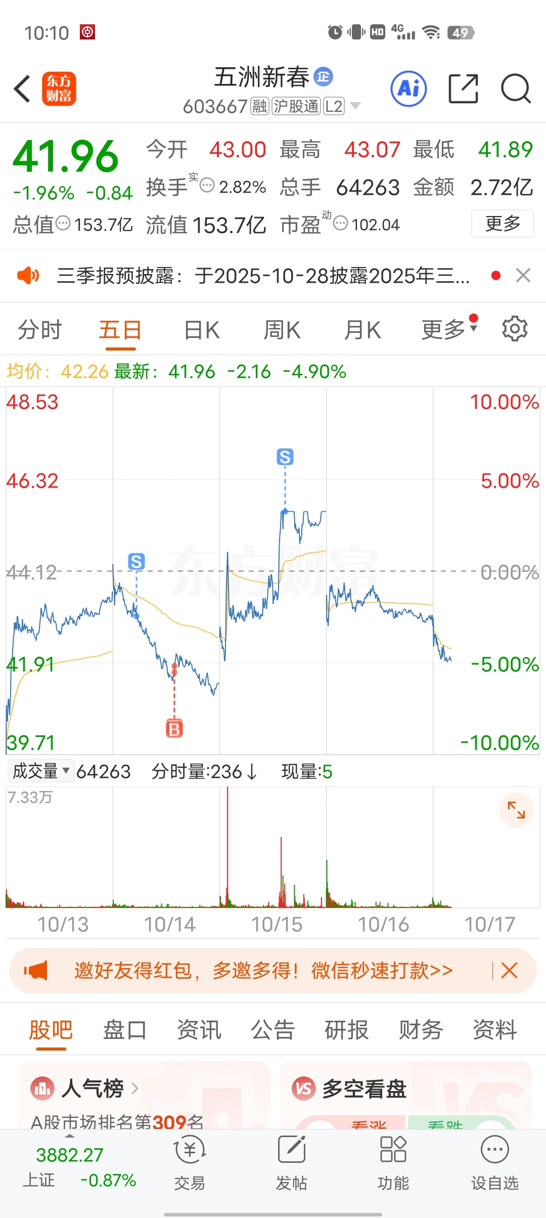 $五洲新春(SH603667)$ 第一次买入是44.65,涨到50多盈利15+没卖,后悔了。然后做个T,涨停出了。受不了经常减持的股!!!!