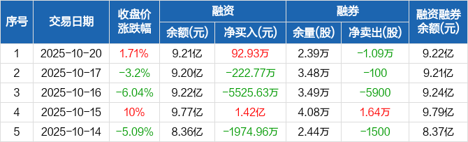 五洲新春:融资净买入92.93万元,融资余额9.21亿元(10-20)