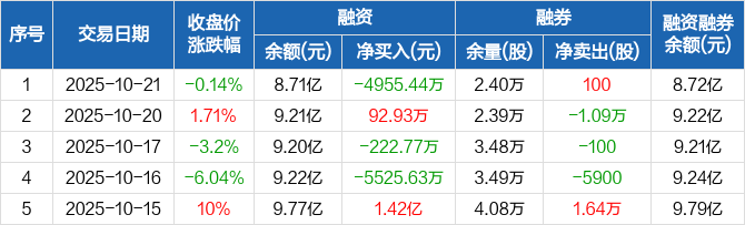 五洲新春:融资净偿还4955.44万元,融资余额8.71亿元(10-21)