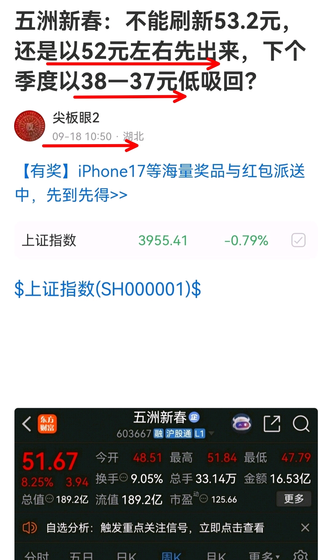 52元左右后跌到39.7元低点拉起到目前高度,不能有效站稳46.6元要卖出来,本周K锤子阳,下周一低开大概率。下周调整
