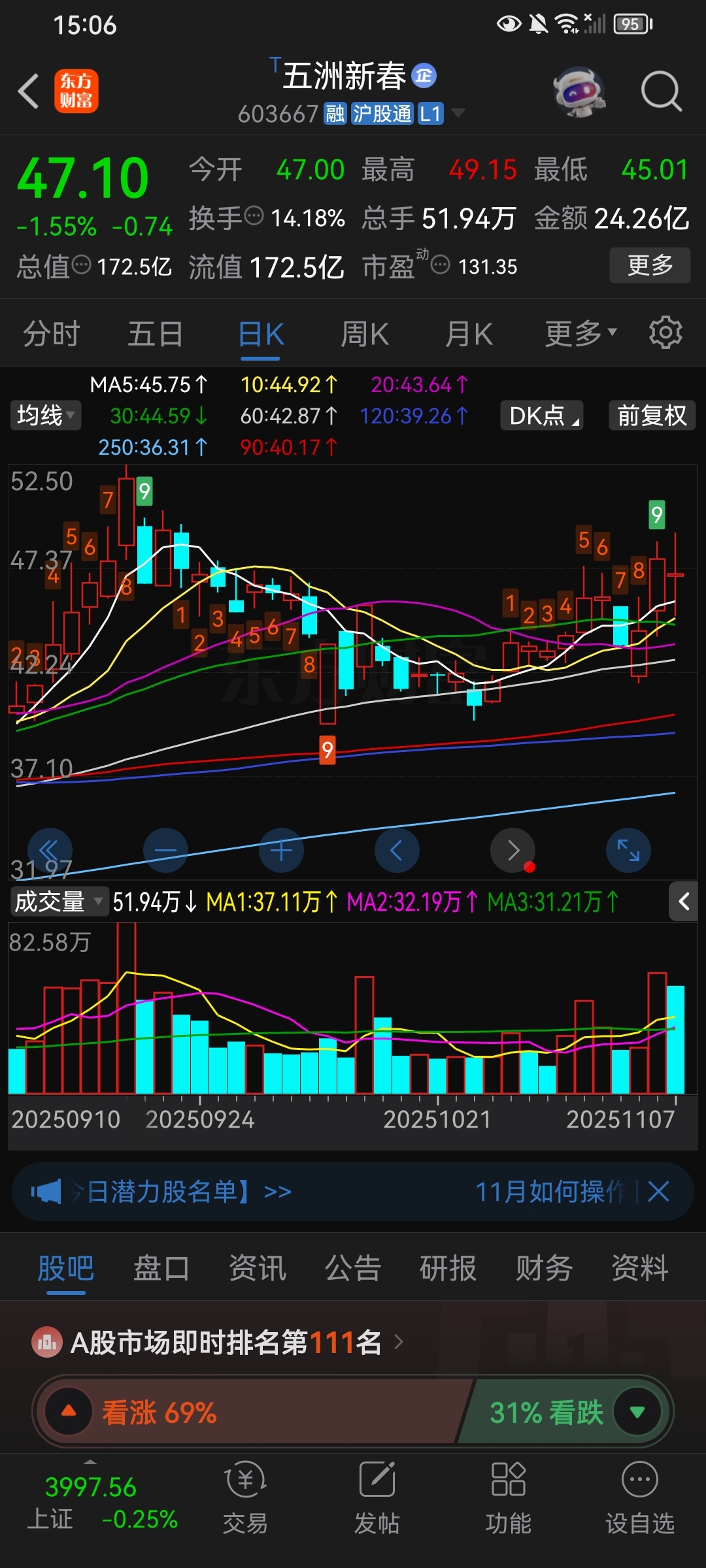 $五洲新春(SH603667)$ 大佬努力T了一个星期,我赌他还没有跑路,日K线收了个大振幅8.65%的红十字