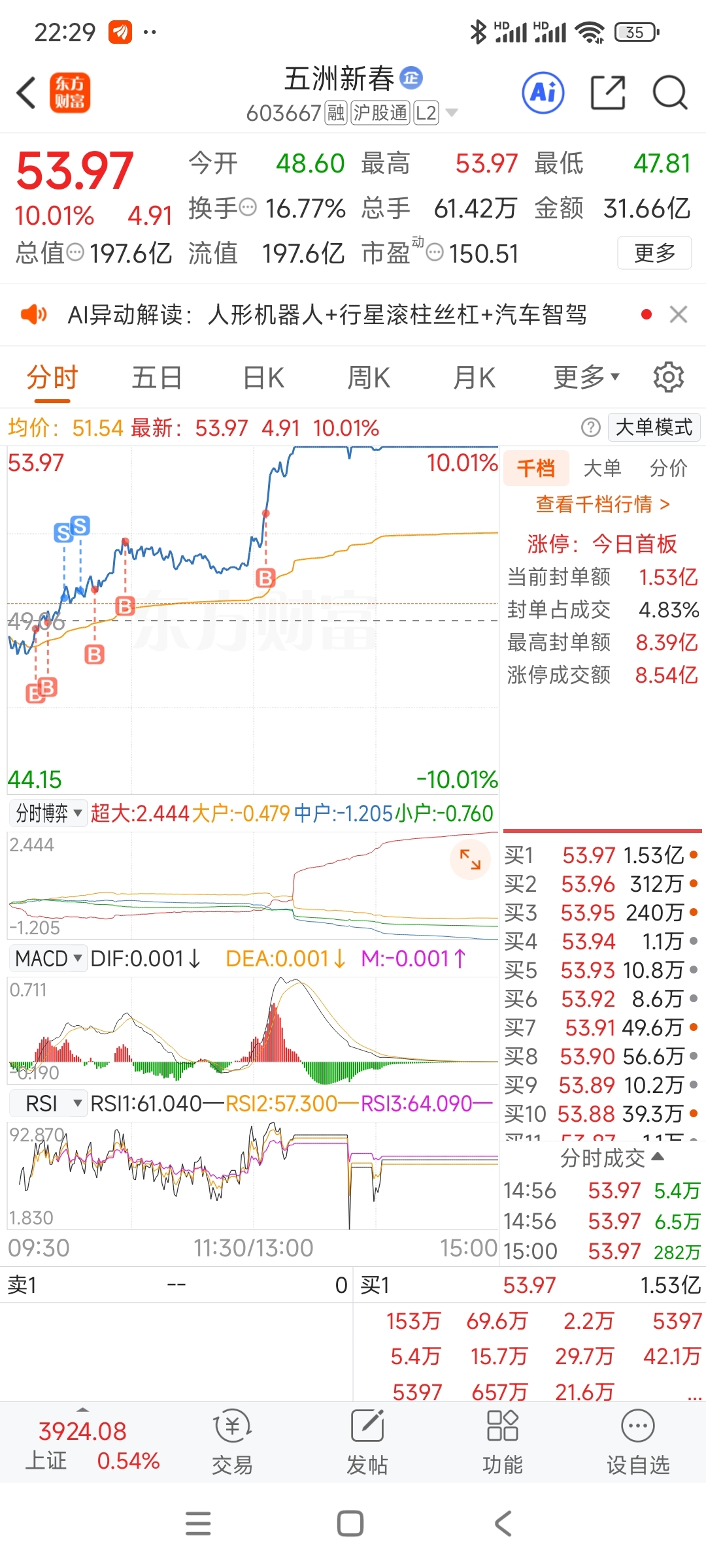 $五洲新春(SH603667)$ 低位买2次,卖了做T,谁知又大涨,高价补,补,补,还好涨停了。机器人轴承,航天轴承,未来前途无量。3板应该没有问题。