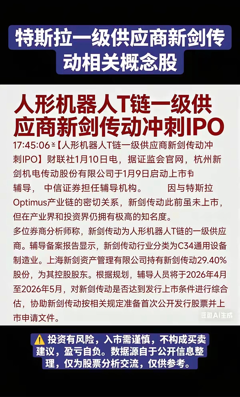 特斯拉机器人一级供应商:新剑传动IPO特斯拉机器人相关核心龙头受益股: