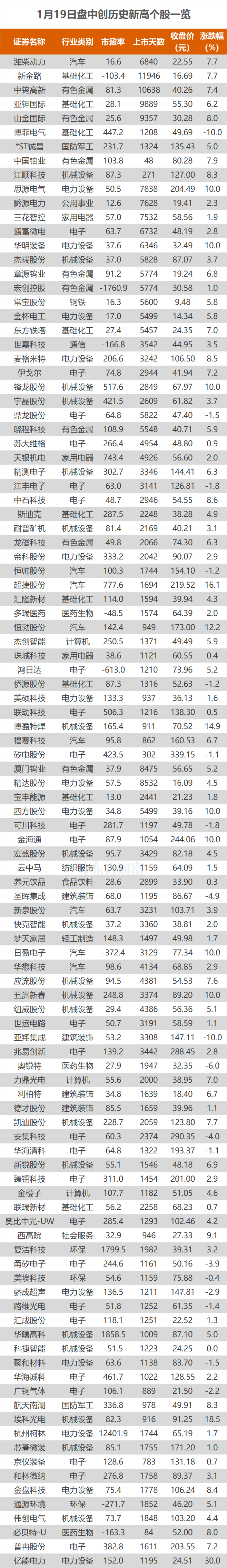 1月19日,A股三大指数今日涨跌不一,截止收盘,沪指涨0.29%,收报4114.00点;深证成指涨0.09%,收报14294.05点;创业板指跌0.70%,收报3337.61点。东方财富Choice数据显示,今日有107只个股盘中股价创历史新高,分别为五洲新春、三花智控等。