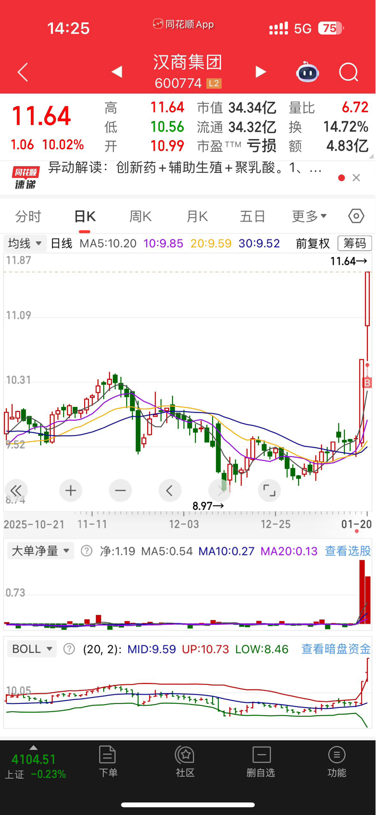 1月20日:模拟盘买入:汉商集团操作记录请勿跟票,你的赢亏自己负责。