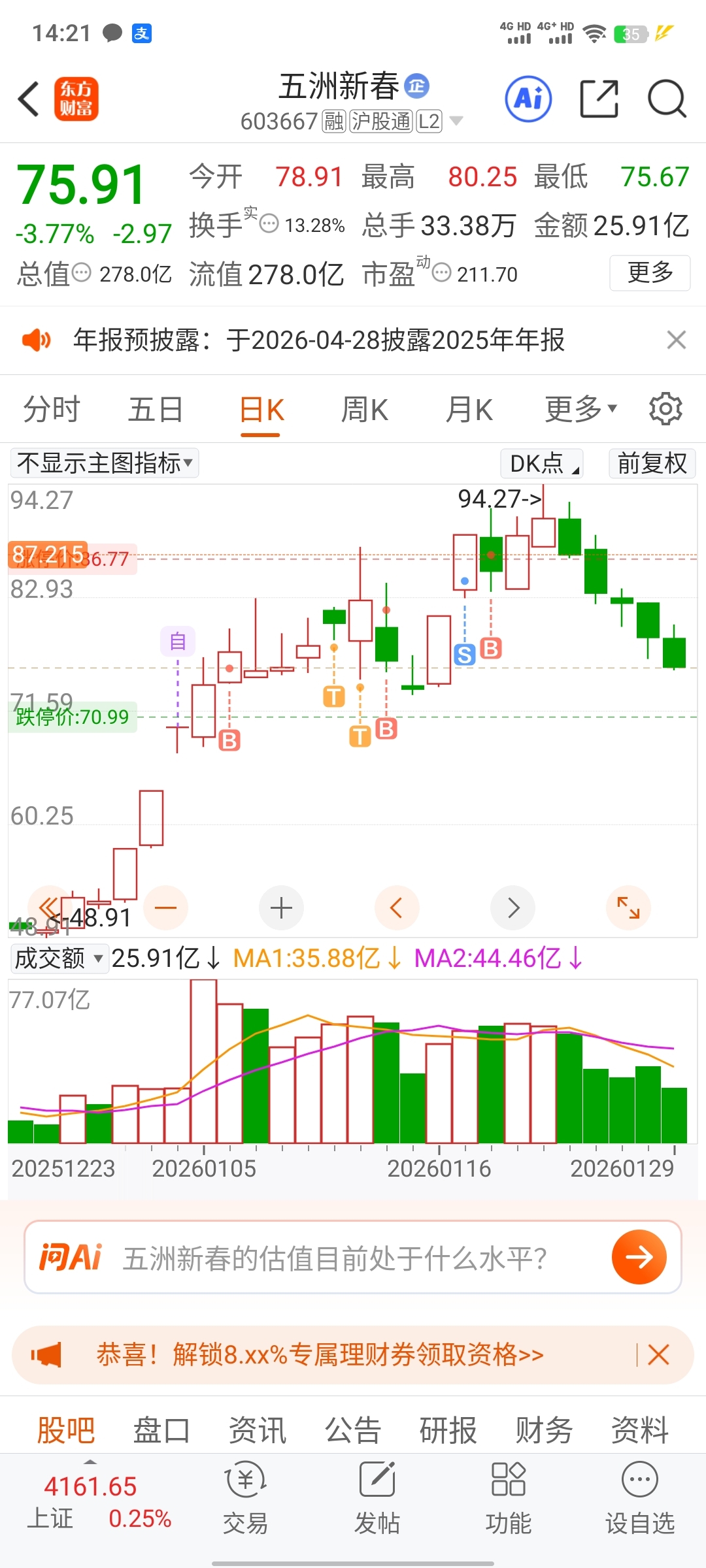 $五洲新春(SH603667)$ 我感觉很可能下跌,所以一直没补仓,但是现在下跌17个点了,今天尾盘先补一点点,明天跌了就要多补一点了。