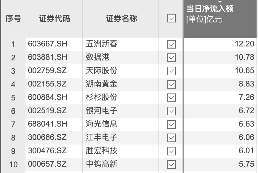 Choice数据显示,2月6日,资金净流入额排名前十的个股依次是五洲新春、数据港、天际股份、湖南黄金、杉杉股份、银河电子、海光信息、江丰电子、胜宏科技、中钨高新。其中,五洲新春获净流入12.20亿元。