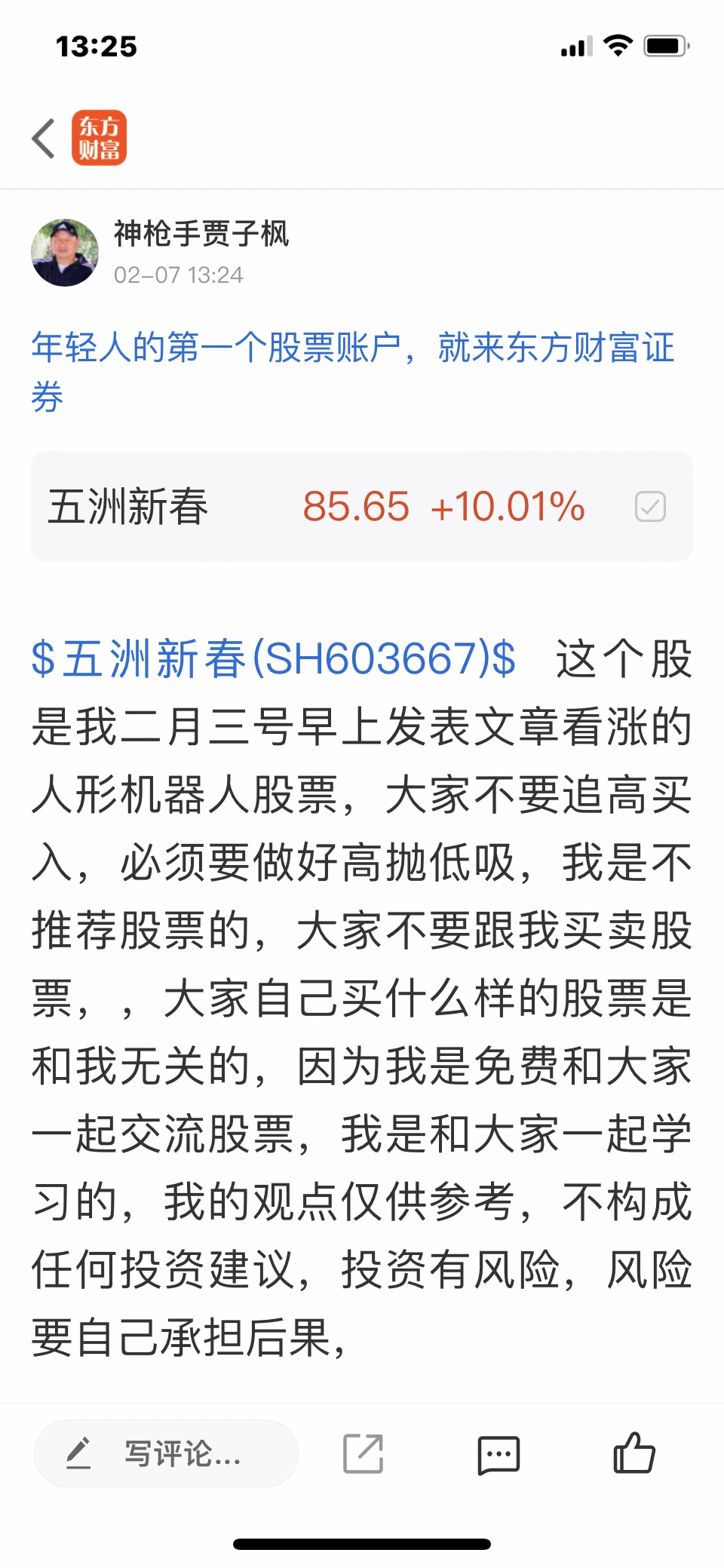 $五洲新春(SH603667)$ 这个股是我二月三号发表文章看涨的春节联欢晚会人形机器人股票,大家不要追高买入,必须要做好高抛低吸,我是不推荐股票的,大家不要跟我买卖股票,大家自己买什么样的股票是和我无关的,因为我是免费和大家一起交流股票,我是和大家一起学习的,我的观点仅供参考,不构成任何投资建议,投资有风险,风险要自己承担后果,