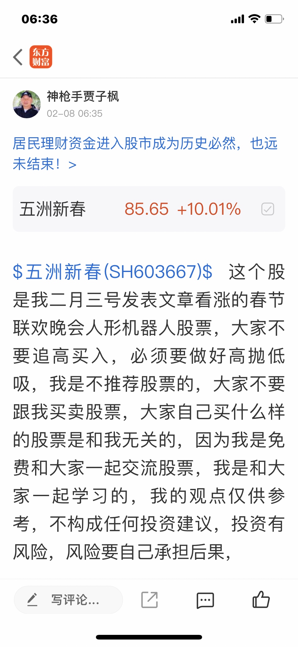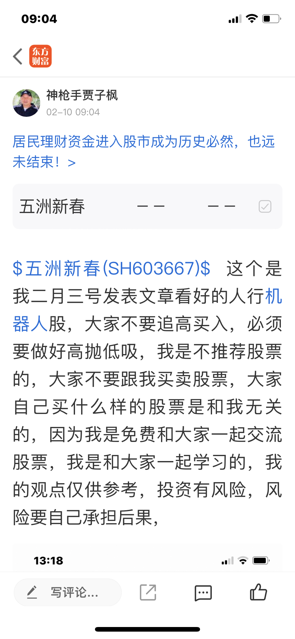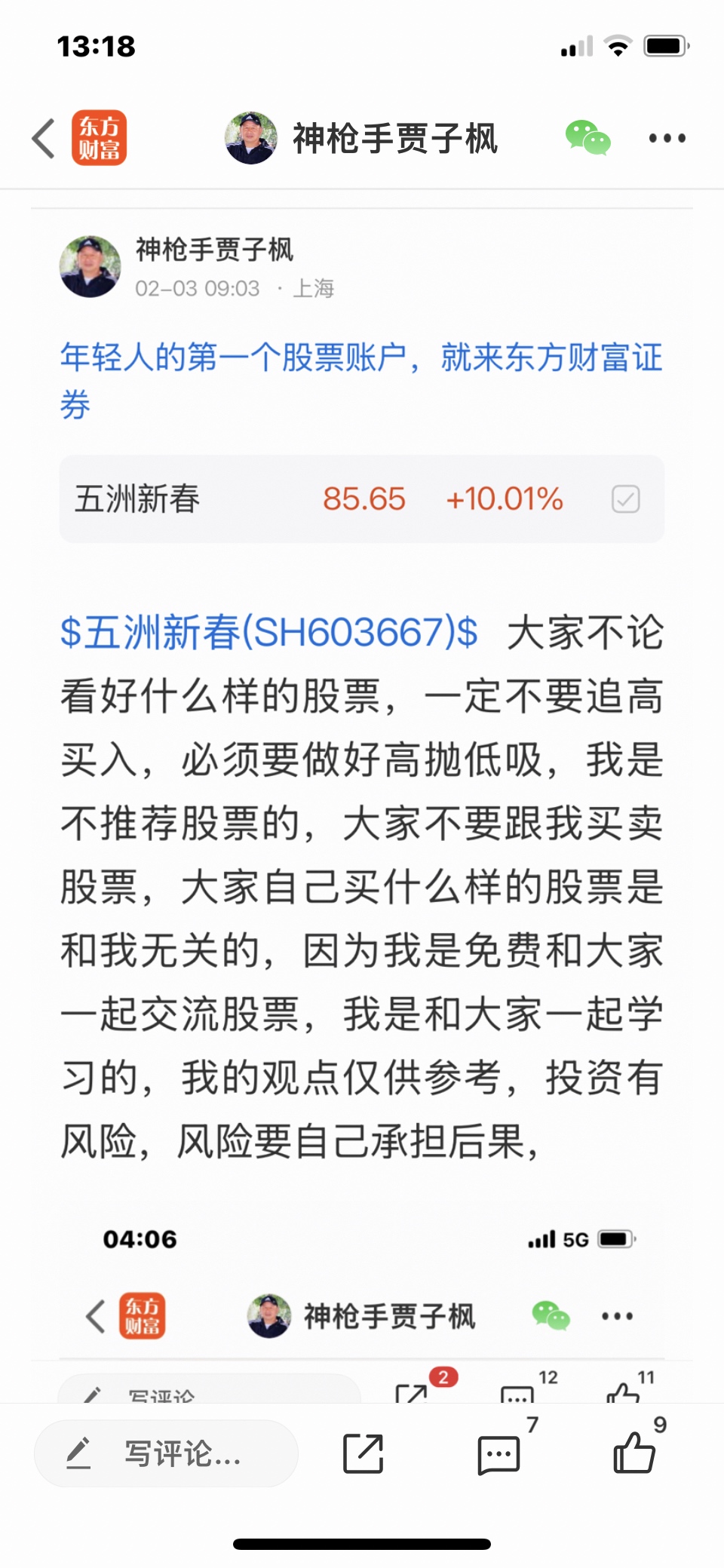 $五洲新春(SH603667)$ 这个股我是二月三号发表上涨的股票,大家不论看好什么样的股票,一定不要追高买入,必须要做好高抛低吸,我是不推荐股票的,大家不要跟我买卖股票,大家自己买什么样的股票是和我无关的,因为我是免费和大家一起交流股票,我是和大家一起学习的,我的观点仅供参考,投资有风险,风险要自己承担后果,