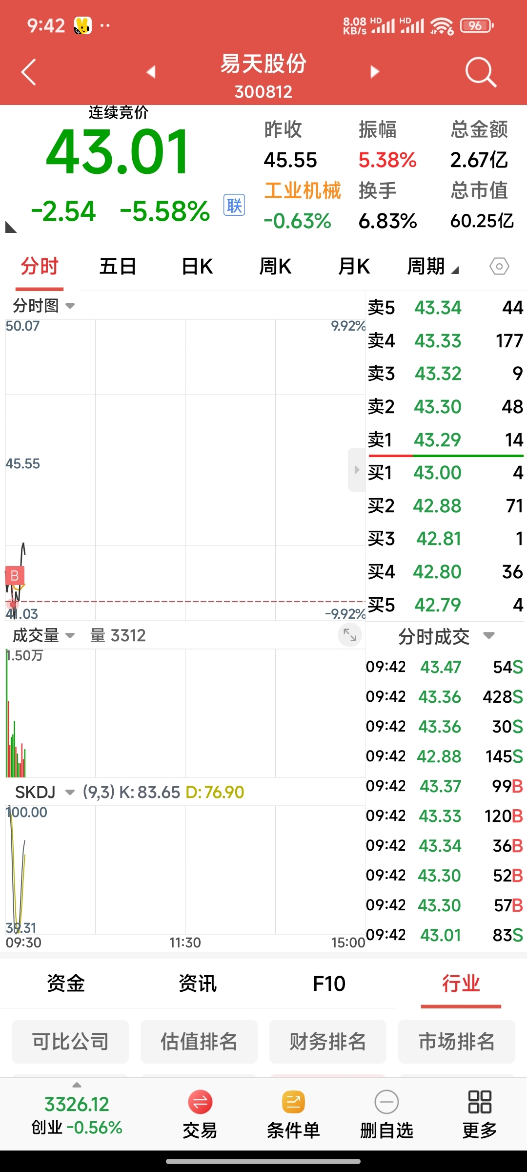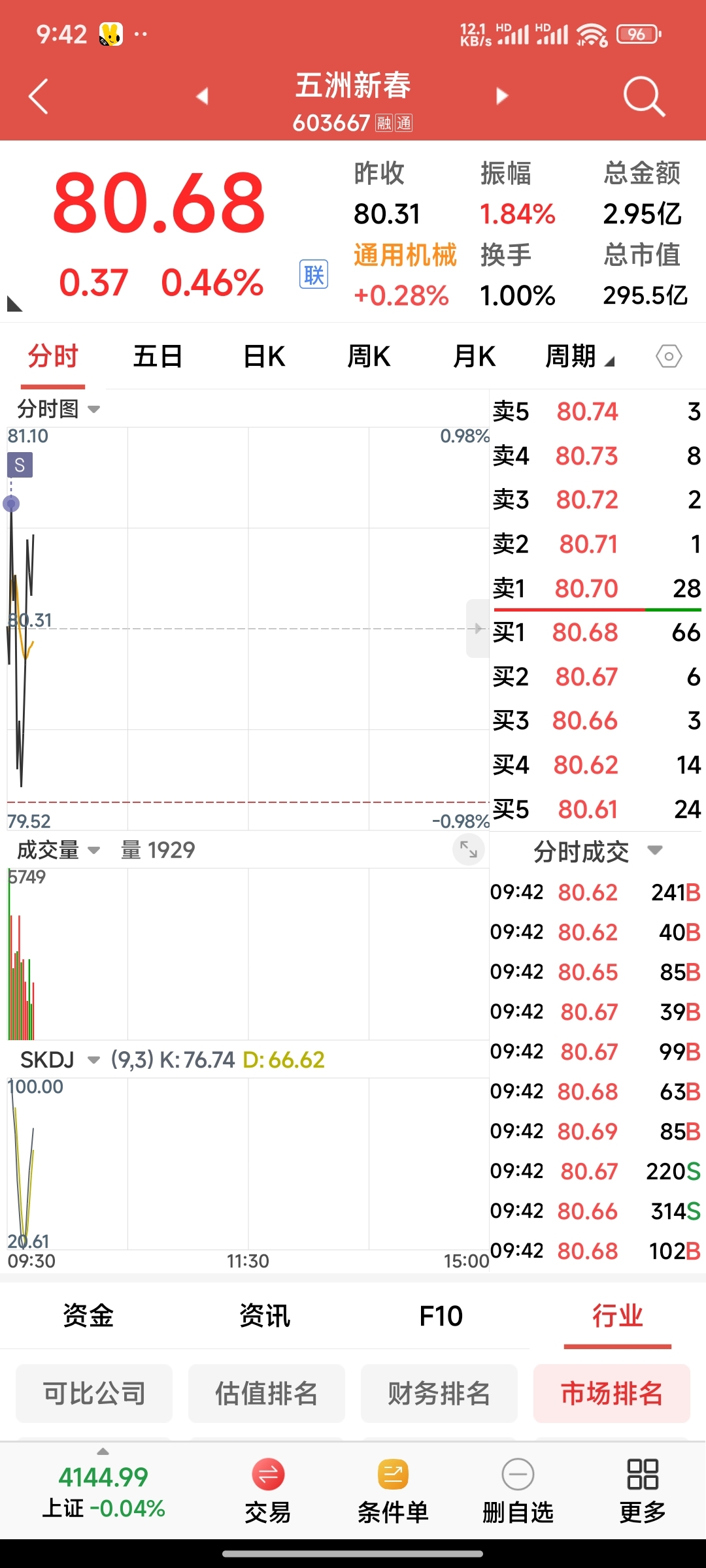 $五洲新春(SH603667)$ $易天股份(SZ300812)$ #炒股日记# 最终还是80.98卖了五洲,纠结了几天盈利2个多点,浪费了2天好行情,易天观察了三天了,一直没有下手,今天这个下杀给我机会上车了41.56买入了,高位振荡就是机会,相信主力志向远大