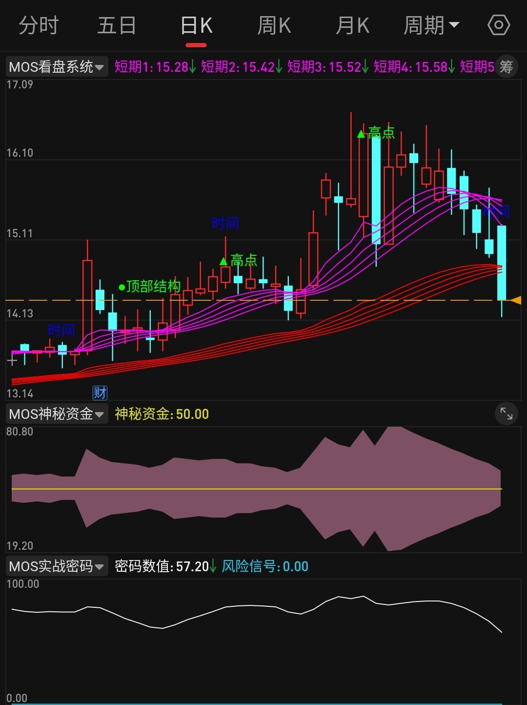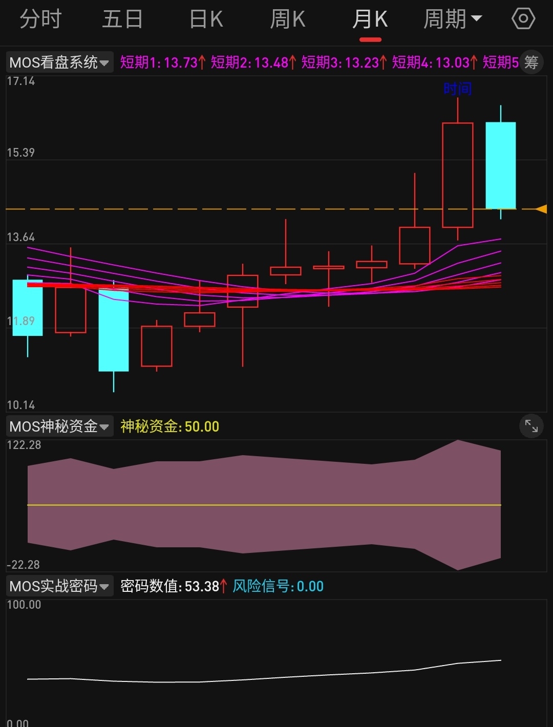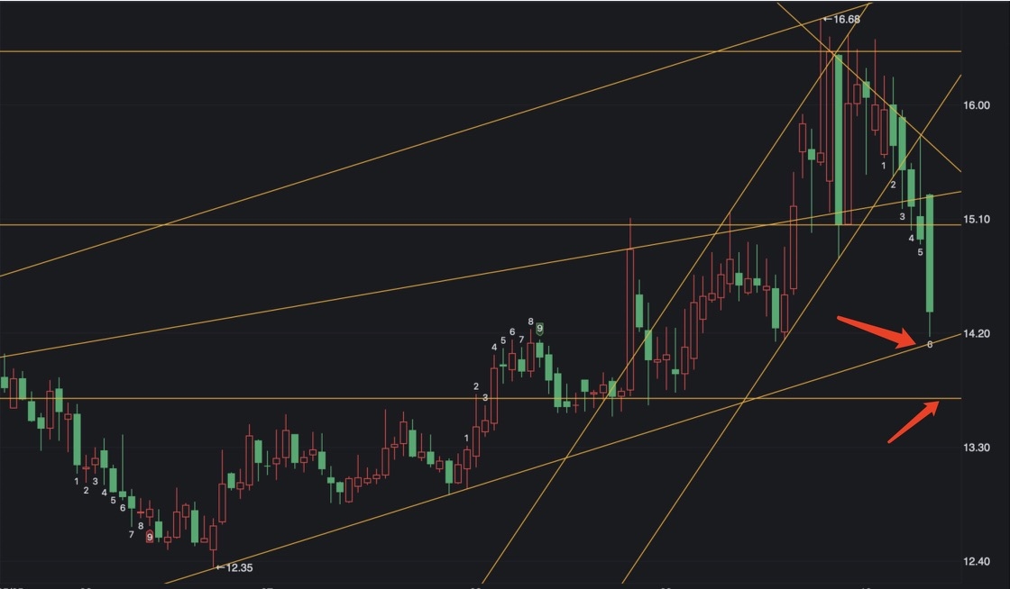 【mos跟踪妖马】主力是个人的话明天就反抽一下日线红色趋势带 不是人的话直接杀到13.70附近 月线乖离率快修复完了