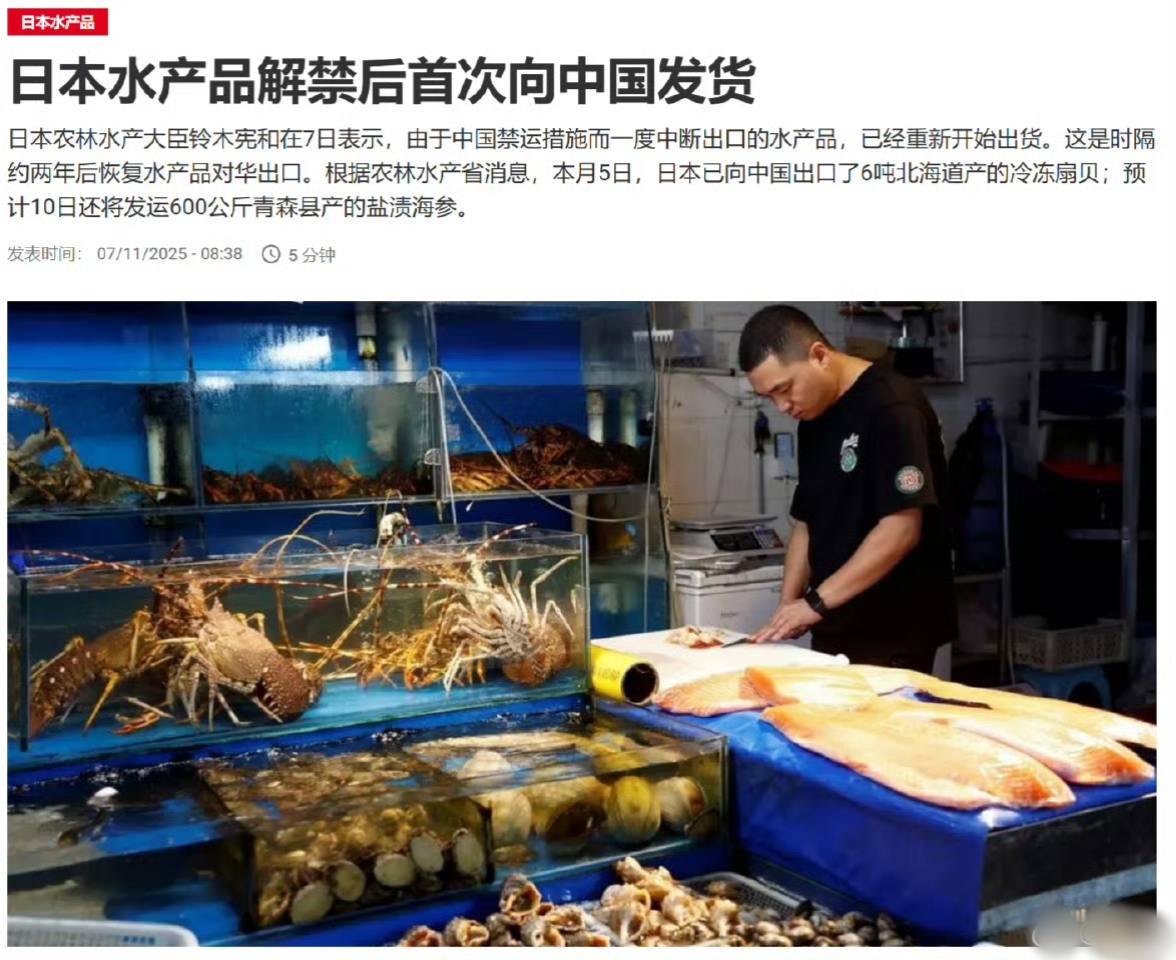 日本农林水产大臣铃木宪和7日表示,中国禁运的水产品,已经重新开始出货。