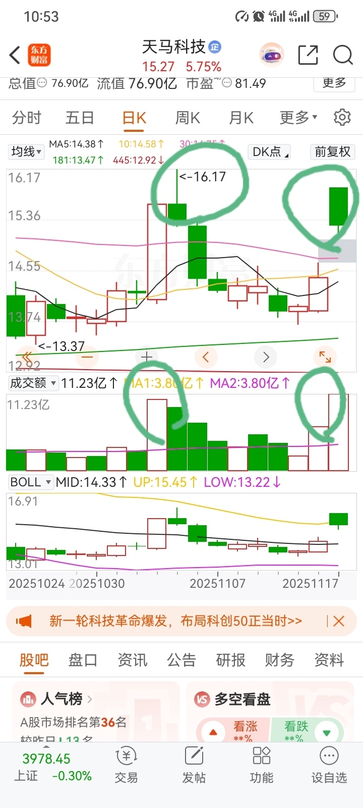 $天马科技(SH603668)$ 成交量比上一个高点高,股价却没有突破新高,明天大跌是不用说了,今天跑路就是最好时期