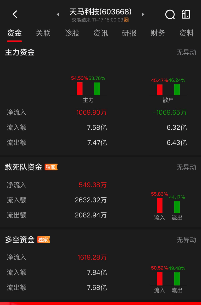 $天马科技(SH603668)$ 主力进的比散户多,慌个球
