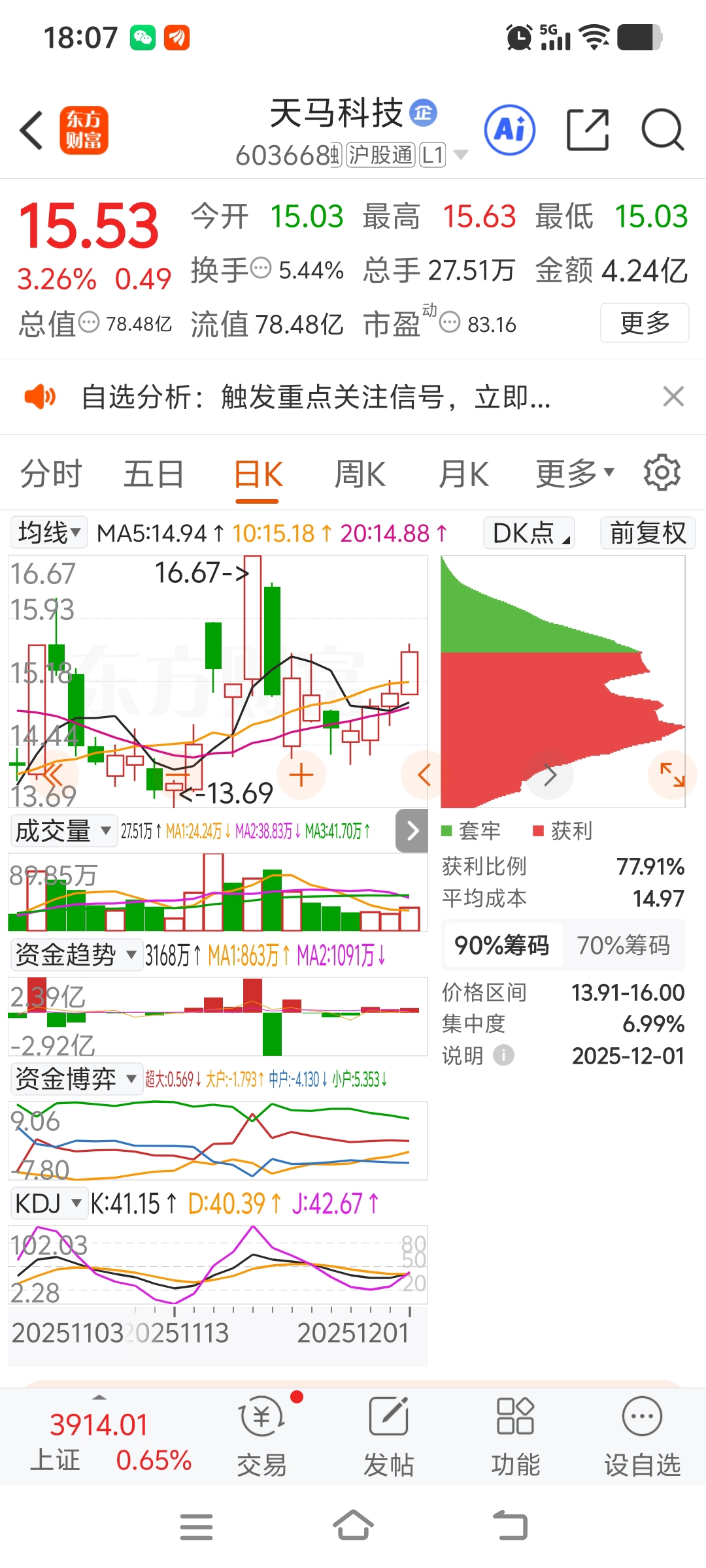 $天马科技(SH603668)$ 爬楼看,当时晒过图,已赚了一块钱了,目前图形很完美,当时可是空头,既然图形整理好了,就该冲板了,冲板不封,立即出别犹豫!