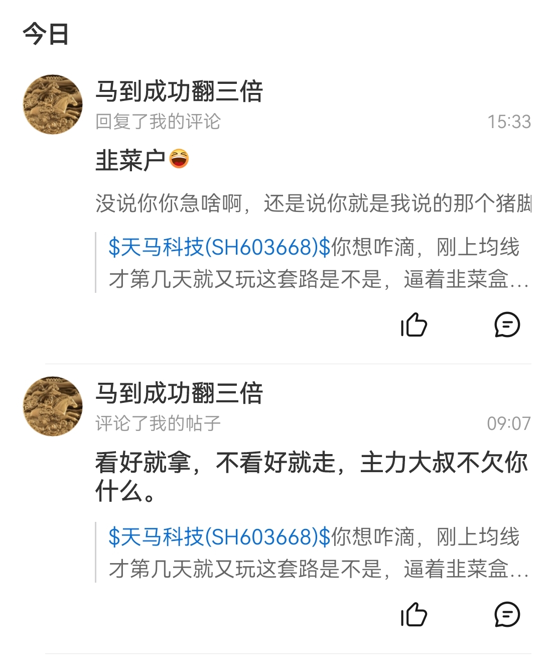 $天马科技(SH603668)$ 股吧不就是畅所欲言的地方吗?没有指名道姓的骂谁居然也有人来开怼,啥人啥想法呢?懂的都懂…怼完了还拉黑,说明了啥?这不是妥妥的对号入座吗