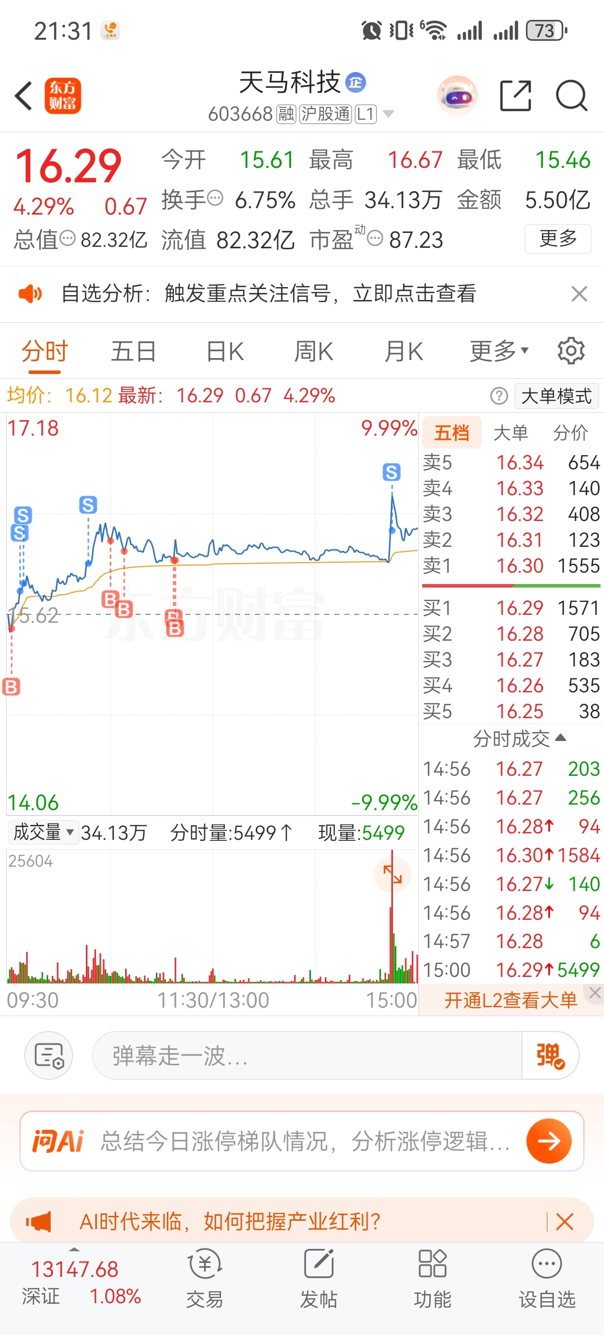 $天马科技(SH603668)$ 今天虽然T赚了2毛钱,但心里很不是滋味,先是卖飞了,后来追进来,再次卖飞,没有卖在高点有点难受…