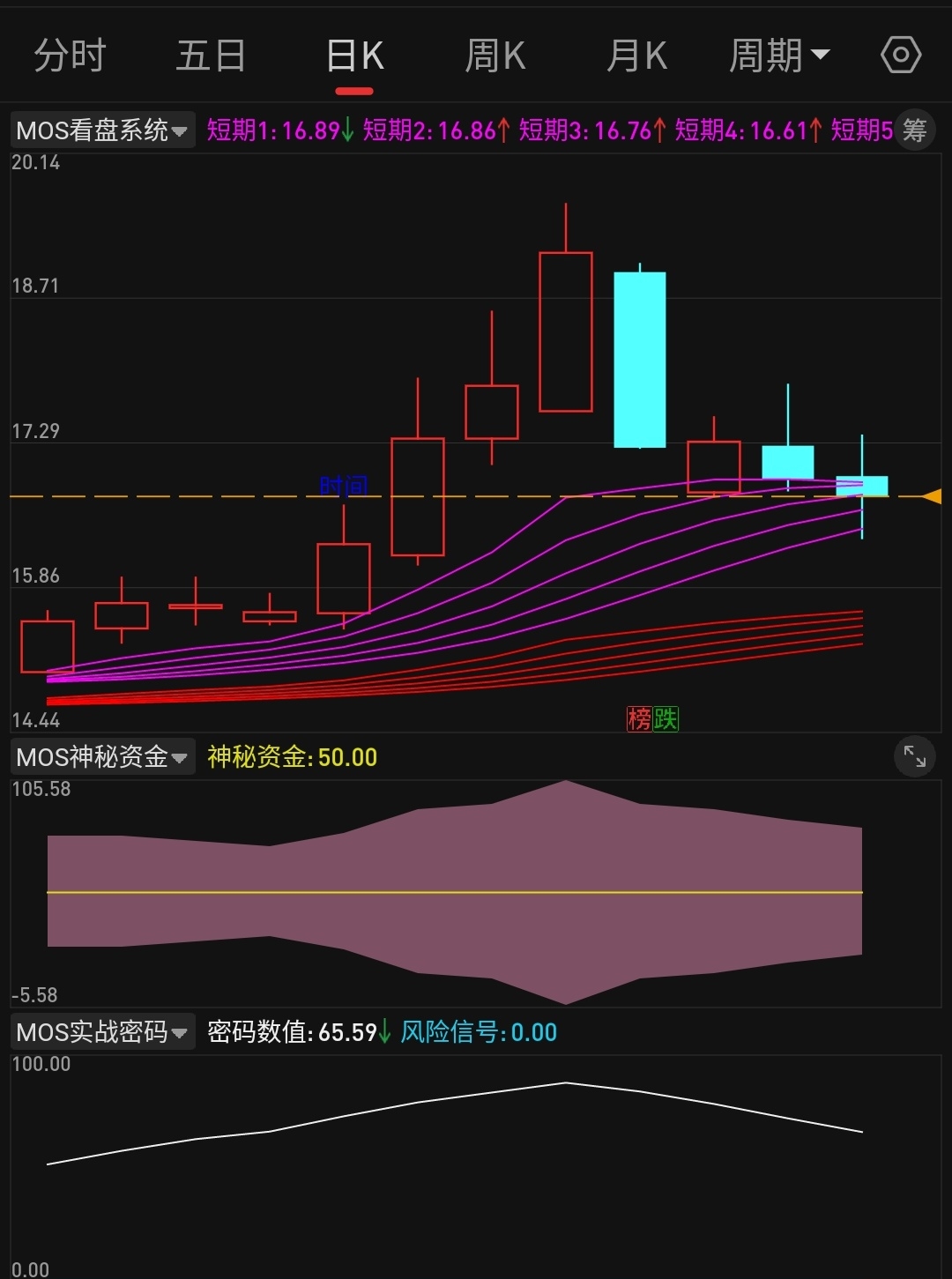 【mos跟踪妖马】神奇吗?上午为啥不去踩20日线?因为被紫色趋势带下轨短暂的撑住了。撑不住的话就奔着红色趋势带去了。